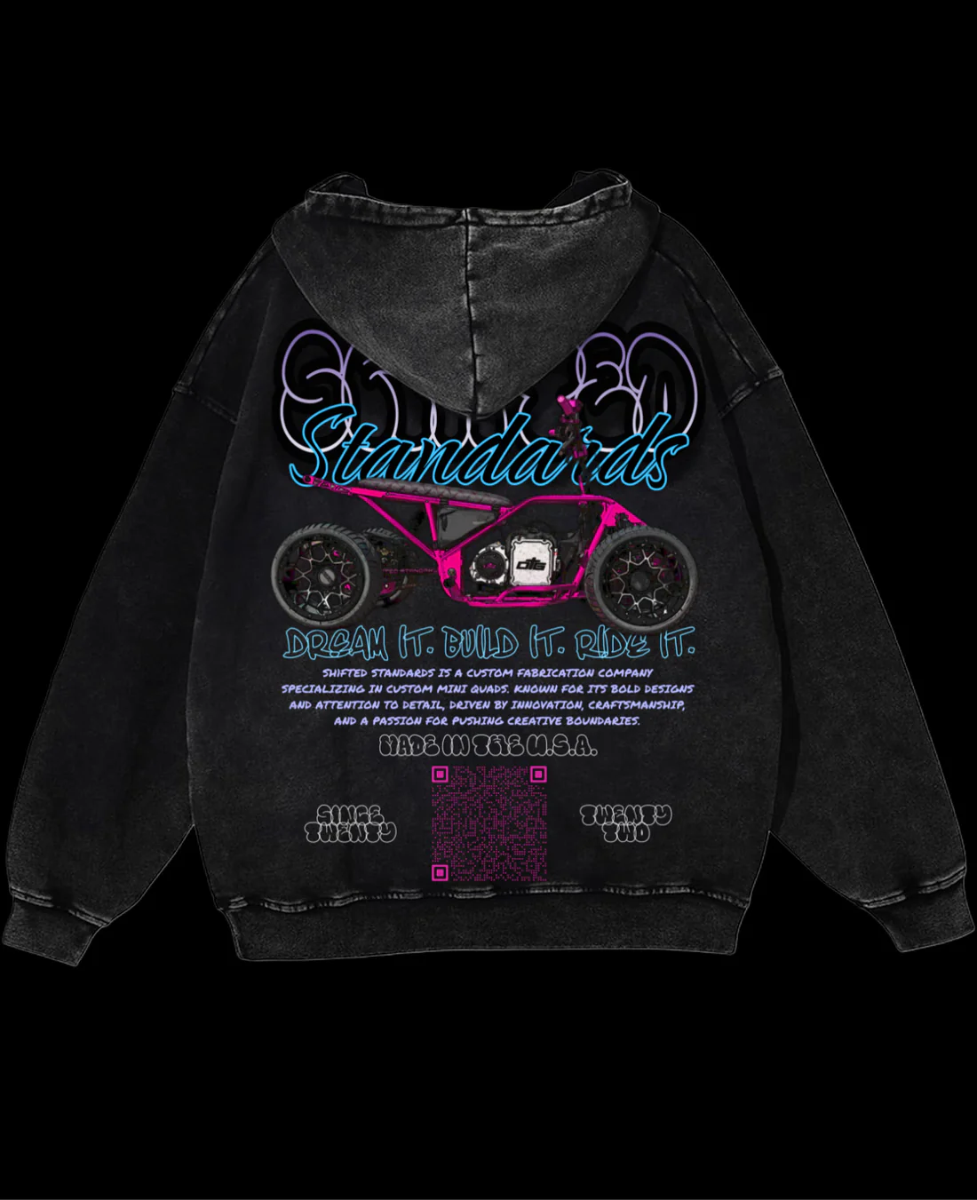 Rep the culture with the Sh1fted Standards Graffiti Hoodie—a premium washed-black hoodie featuring a bold, street-style print of a custom mini build. Designed for riders and builders, it showcases vibrant graffiti artwork, our “Dream It. Build It. Ride It.” slogan, and the signature Sh1fted Standards frame graphic.