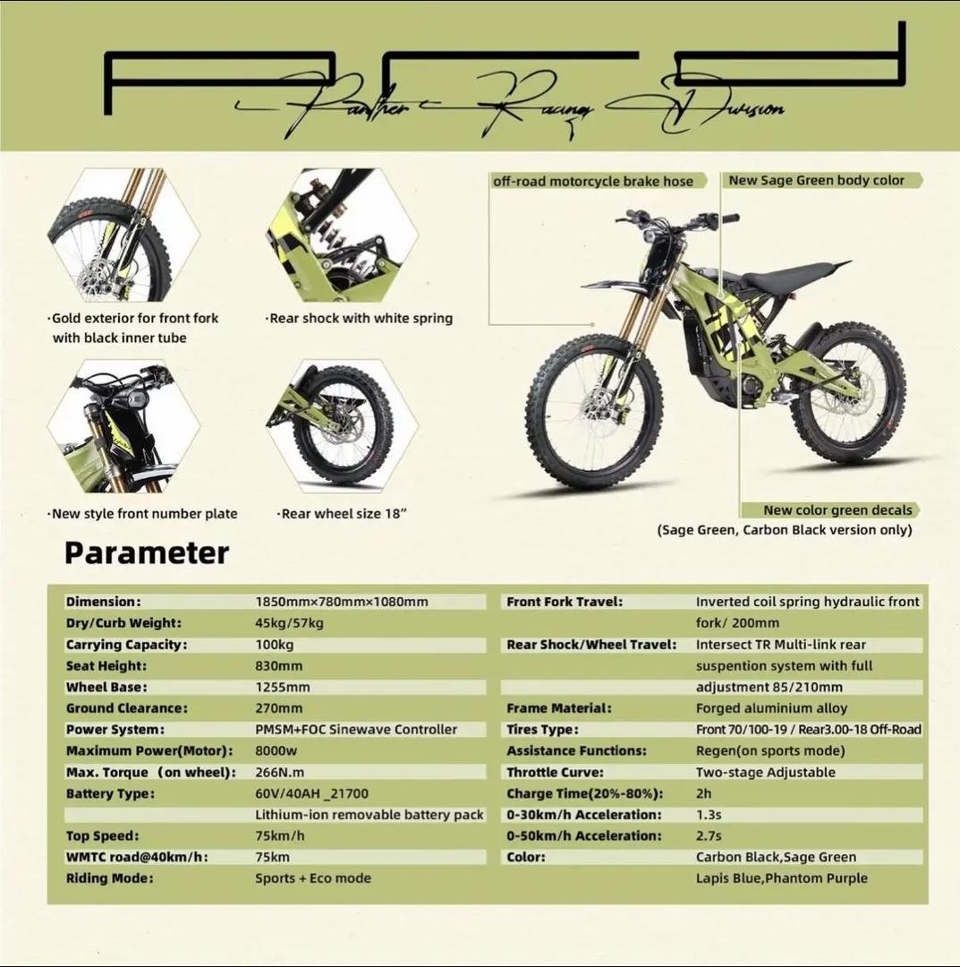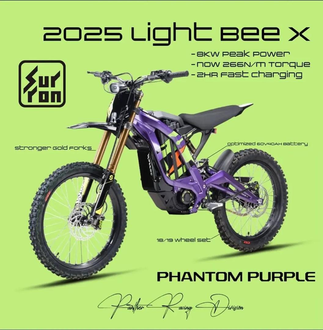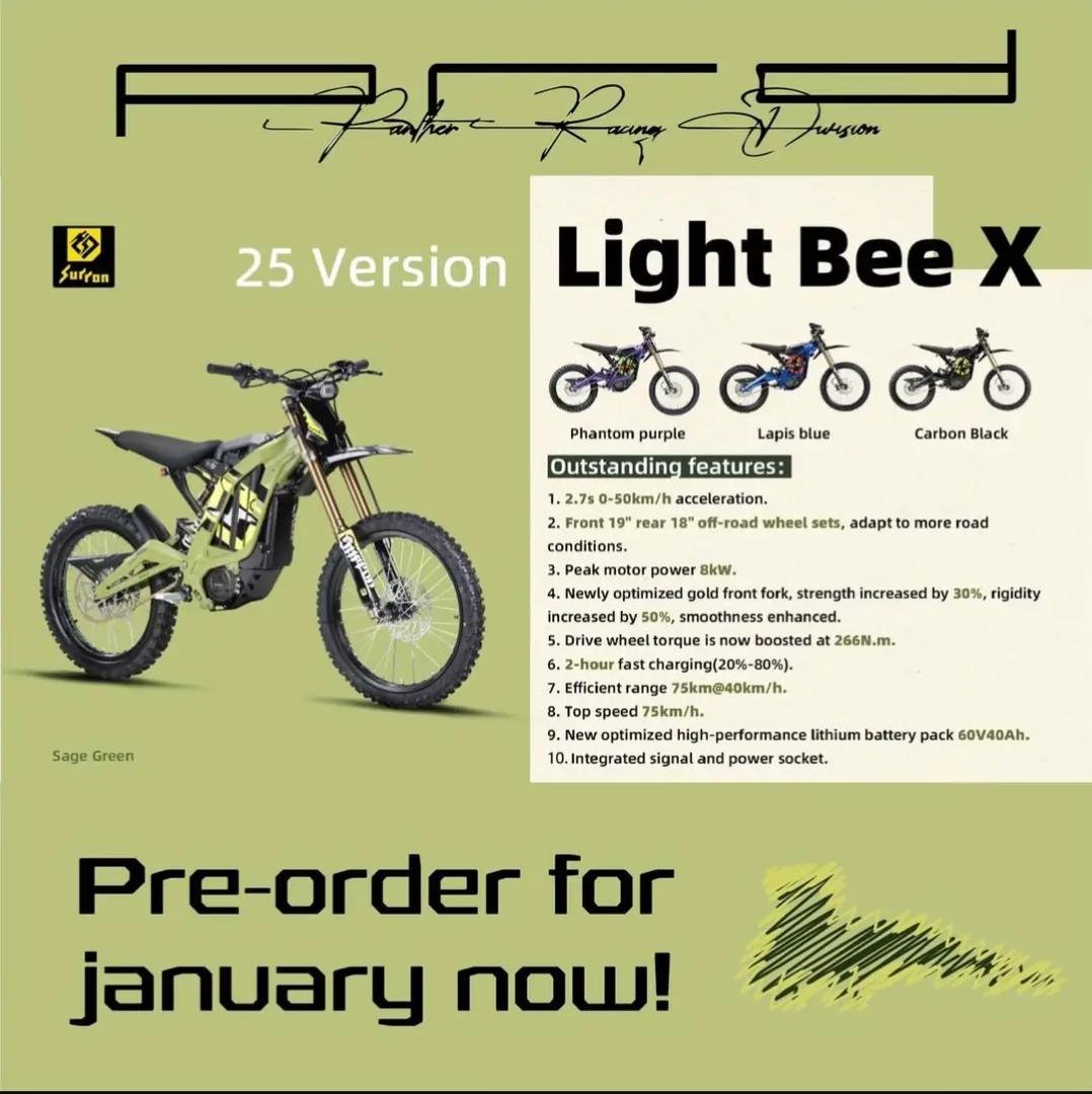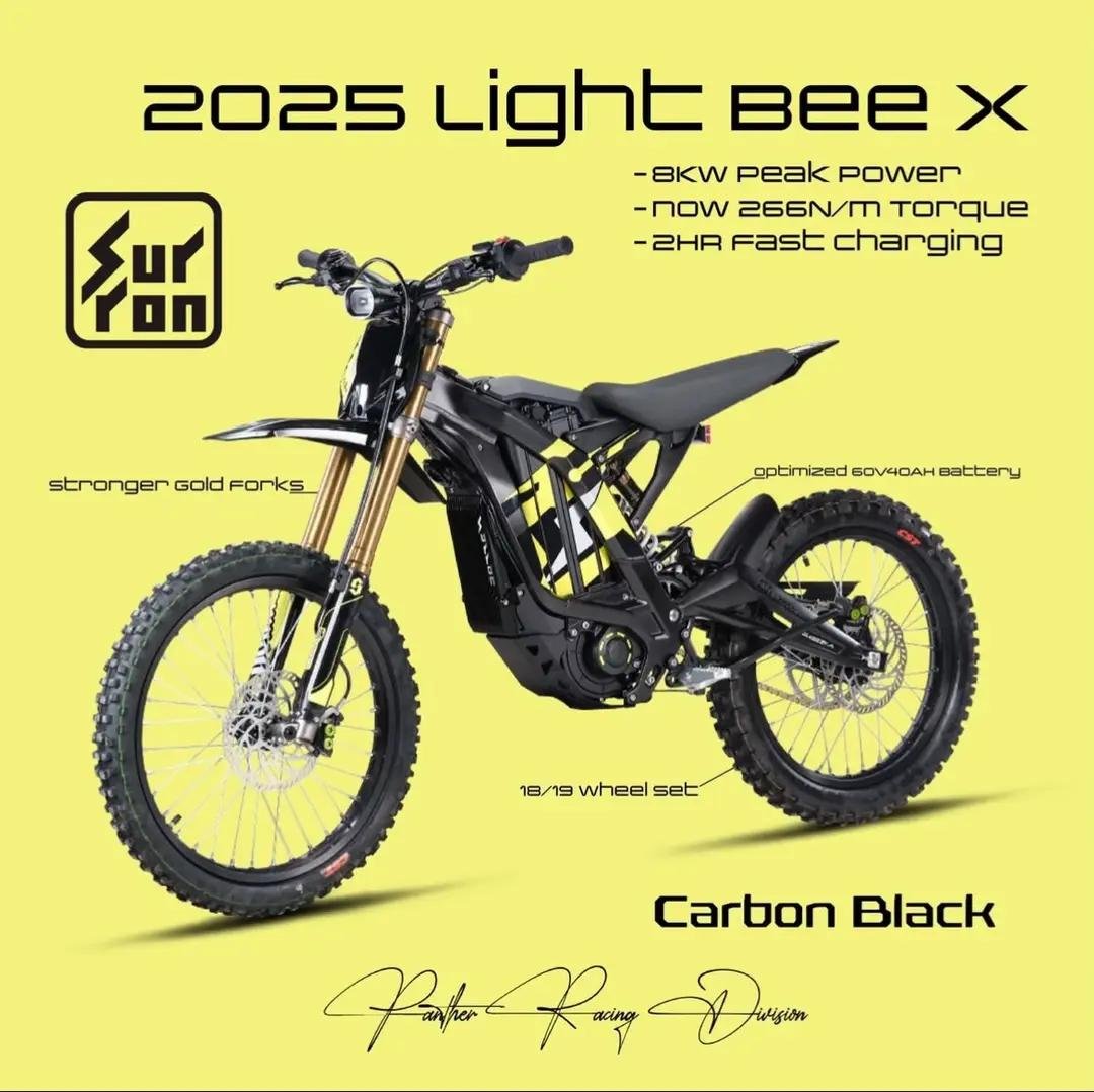 The SURRON LIGHT BEE X offers 60V of power from a removable 32AH Panasonic Lithium ion battery pack with 4-piston hydraulic disc brakes Front and Rear. Climbing ability of over 45 degree and up to 100km of range and a short 2.5-3.5 hour charge time.